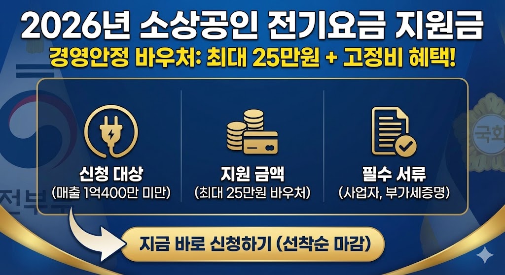 인천에서 부모님의 과일 가게와 빵집 일을 돕다 보니, 매달 나가는 전기세와 공과금이 사장님들께 얼마나 큰 부담인지 잘 알고 있습니다. 2026년에는 기존 '전기요금 특별지원'이 **'소상공인 경영안정 바우처'**라는 이름으로 통합되어 혜택이 더욱 커졌습니다. 단순히 전기요금만 깎아주는 것이 아니라 가스비, 통신비, 보험료까지 쓸 수 있는 카드 포인트 형태로 지급됩니다.